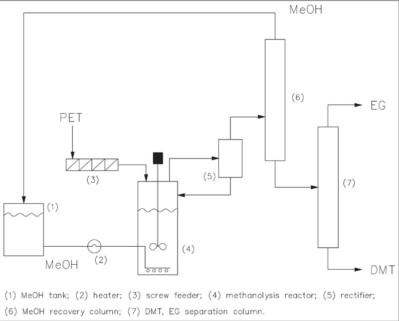 تنطوي هذه العملية على تحلل حيوان أليف في الميثانول (MeOH) عند درجة حرارة-من من من من من من من من من 2-4 MPa. منتجات التفاعل الرئيسية هما DMT و EG ، وهي مواد خام لتجميع oriالبوليمر الأصلي. يمكن أن يستمر تحلل الميثانول إما من خلال تحلل السكر متبوعًا بميثانول ترانزستريفيشن أو عن طريق وضع حيوان أليف مباشرة في الميثانول. ركزت الطرق المبكرة على تحلل الميثانول في الطور السائل ، في حين تستخدم الطرق الأحدث بخار الميثانول عن طريق إزالة منتجات التفاعل جنبًا إلى جنب مع المذيب كبخار. في هذا النهج ، يمر بخار الميثانول فائق التسخين عبر خليط التفاعل ، مشكلاً ذوبانًا يحتوي على بوليستر منخفض الوزن الجزيئي ، مونومرات ، أوليغومرات ، جليكول ، و DMT.